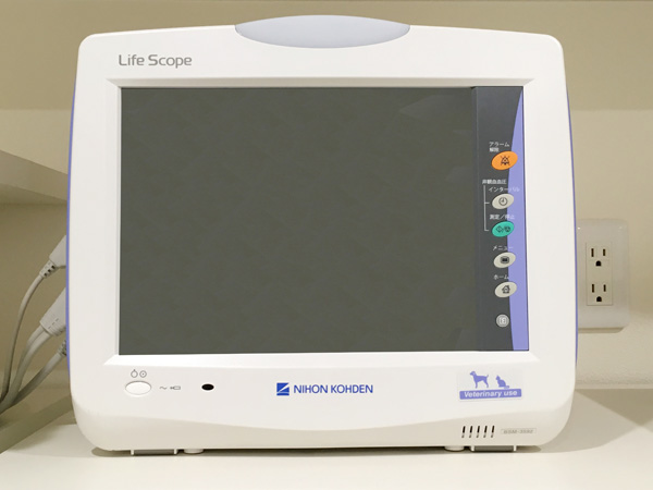 麻酔中に人の感覚よりも早く状態の変化を見つけてくれる機械です。 心拍、呼吸、血圧、体温、酸素飽和度などを検査できるため、通常診察時でも利用できます。