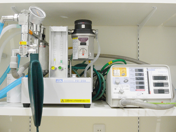 麻酔中の呼吸管理を安全に行ってくれる機械です。呼吸の回数・圧力・流量などの調節により 麻酔事故のリスクを大幅に減らすことができます。